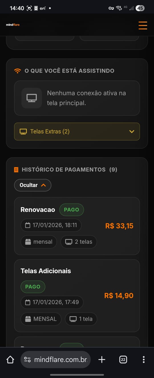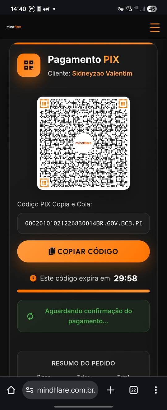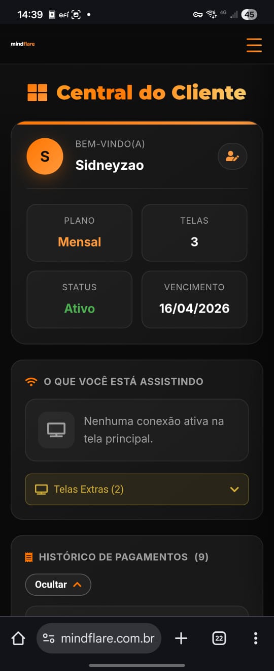 Abaixo estão demonstrações reais (prints e vídeos) de funcionalidades já implementadas: área do cliente, histórico de pagamentos, botões no WhatsApp e fluxo Pix/QR Code.