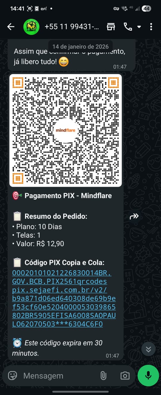 Cobrança com QR/copia-e-cola enviada direto no chat.