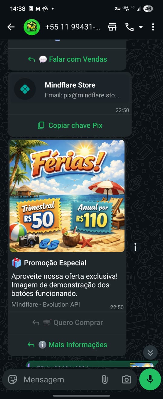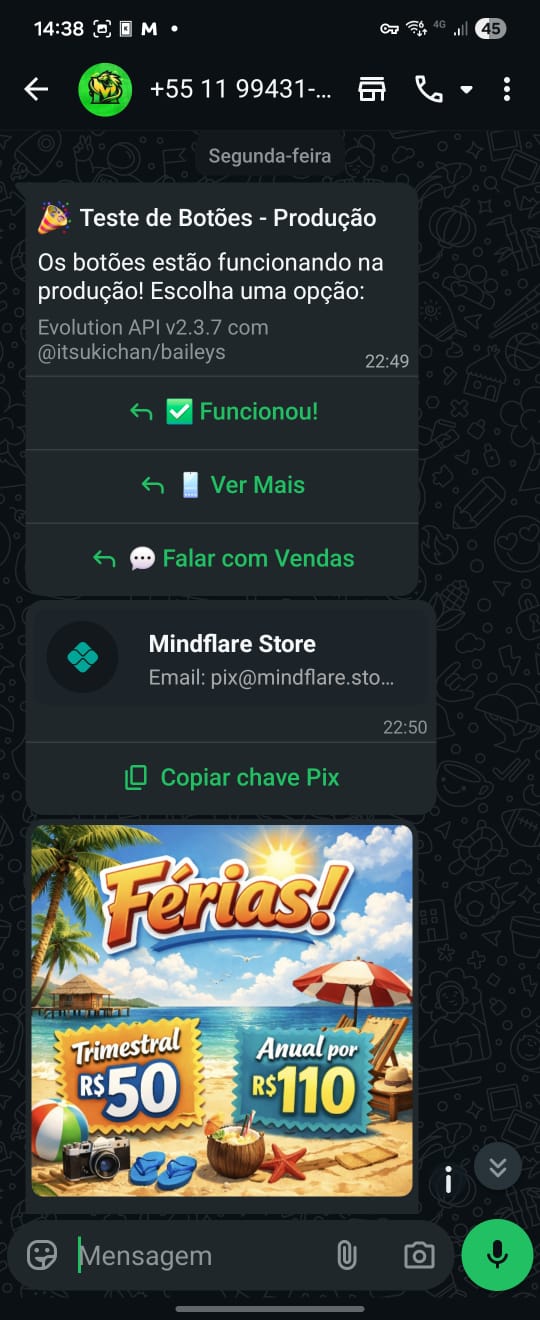 Demonstração real dos botões (reply/list/cta/copiar/pix) funcionando no WhatsApp.